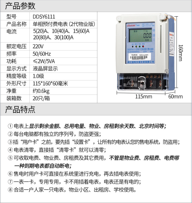 主要特點:應用計算機管理,先購電后用電;在額定電流范圍內能限制使用功率(由供電部門限定);一表一卡,專卡專用,失卡不失電,補卡再用;電卡能雙向傳遞數據,能自動斷電告警用戶購電;電量為零時,自動拉閘斷電;并具有一定的防竊電軟件設計等。