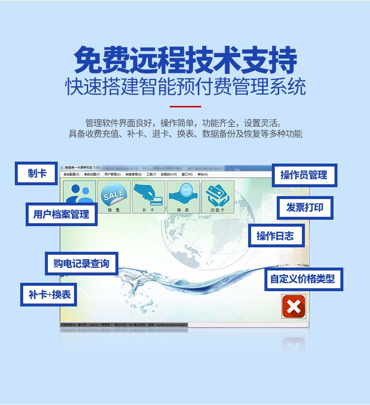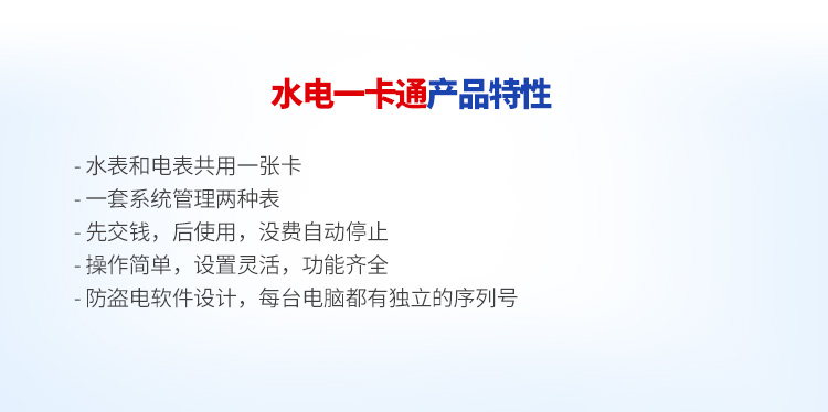 水電一卡通預(yù)付費(fèi)管理系統(tǒng)由本公司生產(chǎn)的預(yù)付費(fèi)電表、預(yù)付費(fèi)水表、讀寫器和一卡通管理軟件構(gòu)成,物業(yè)管理部門可通過本系統(tǒng)完成對水費(fèi)、電費(fèi)和天然氣費(fèi)的智能化管理,無需挨家挨戶抄表收費(fèi),由用戶通過一張IC卡購水購電,先交費(fèi),后用水用電,解決了抄表累、收費(fèi)難的問題,該系統(tǒng)是物業(yè)管理部門的好幫手, 該管理軟件界面良好,操作簡單方便,易學(xué)易用,功能齊全。